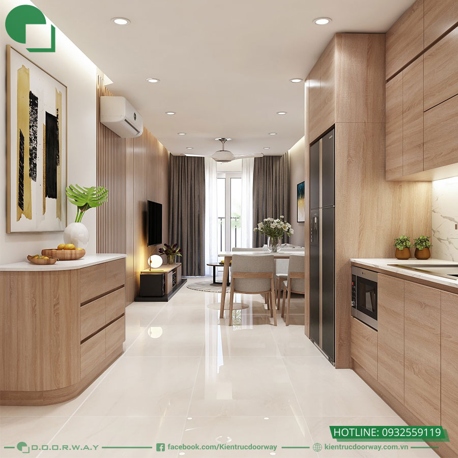 Mẫu thiết kế nôi thất phòng khách nhà phố sang trọng liền với bếp tạo nên không gian ấm cúng và tiện nghi. Vật liệu gỗ công nghiệp được ưu tiên trong thiết dự án này