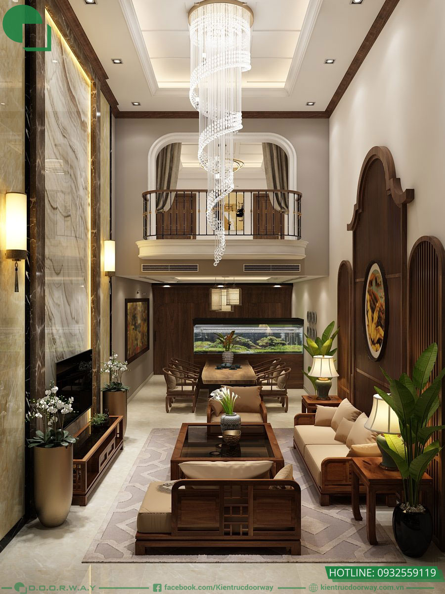 Mẫu phòng khách thông tầng với lối thiết kế nội thất hiện đại, sang trọng và vô cùng tiện nghi cùng những chi tiết nhấn nhá độc đáo và ấn tượng: