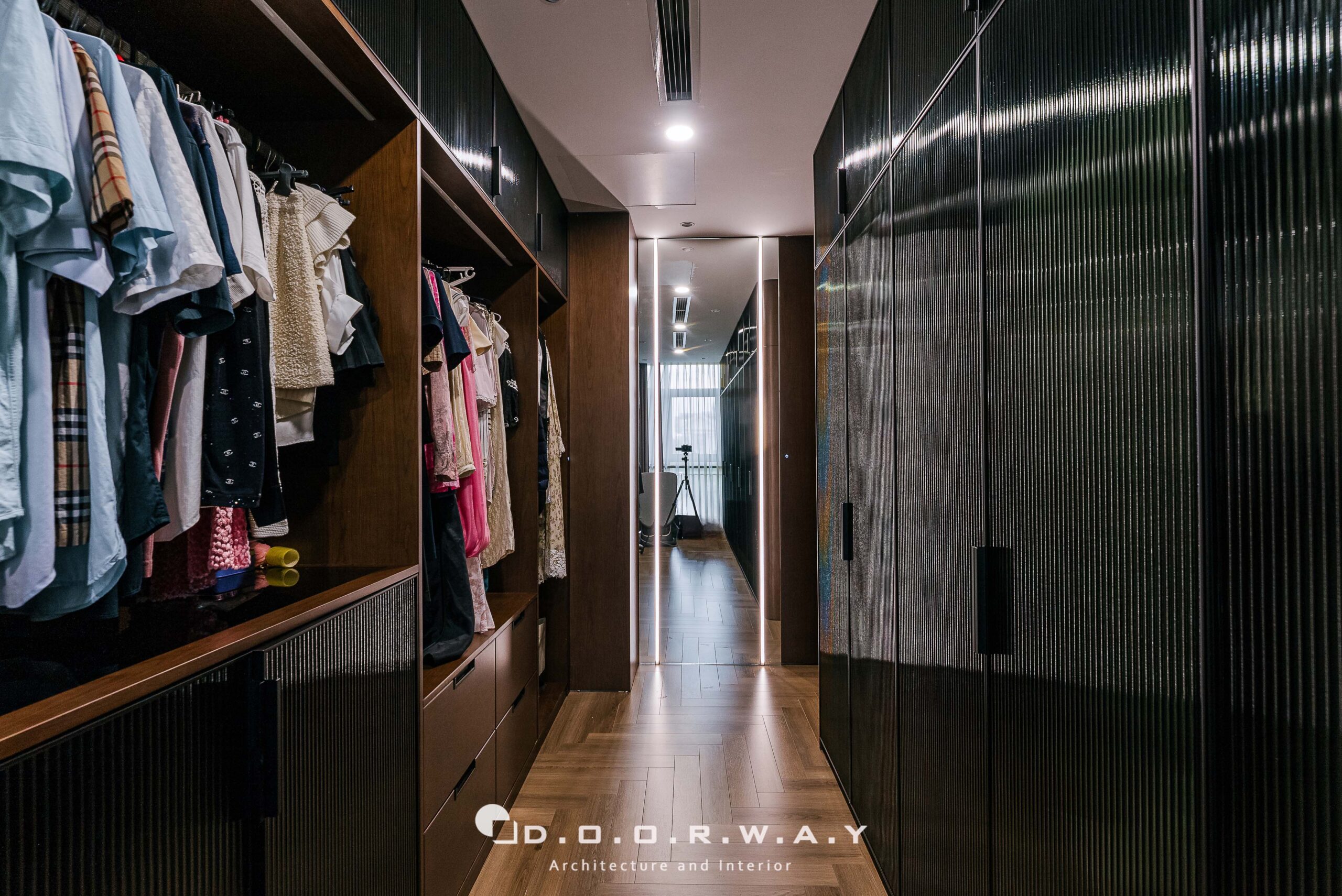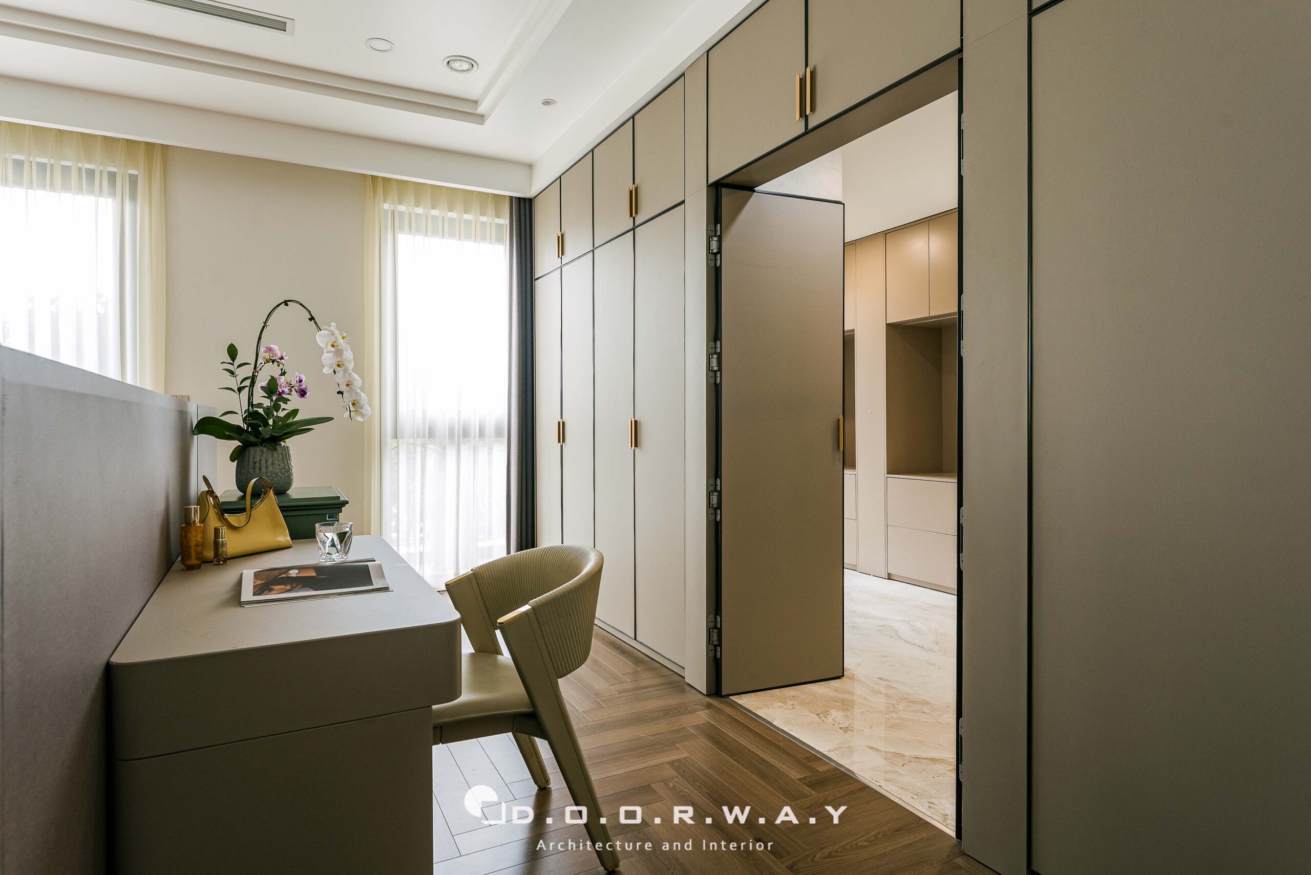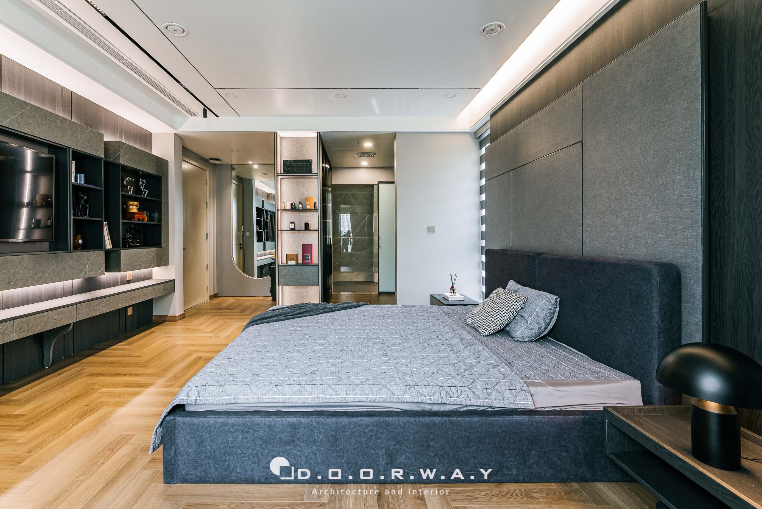 Đước ngăn cách với không gian chính của phòng ngủ và khu thay đồ, các kts D.O.O.R.W.A.Y đã tinh tế sử dụng hệ cửa dấu khuôn, để không làm ảnh hưởng đến tổng thể rộng rãi của căn phòng. phòng. Không gian phòng thay đồ không quá rộng nhưng vẫn đảm bảo sự sang trọng và tiện nghi với hệ tủ kịch trần cánh kính màu tối tạo chiều sâu huyền bí, những đường vân và ánh phản chiếu khiến từng bộ trang phục.