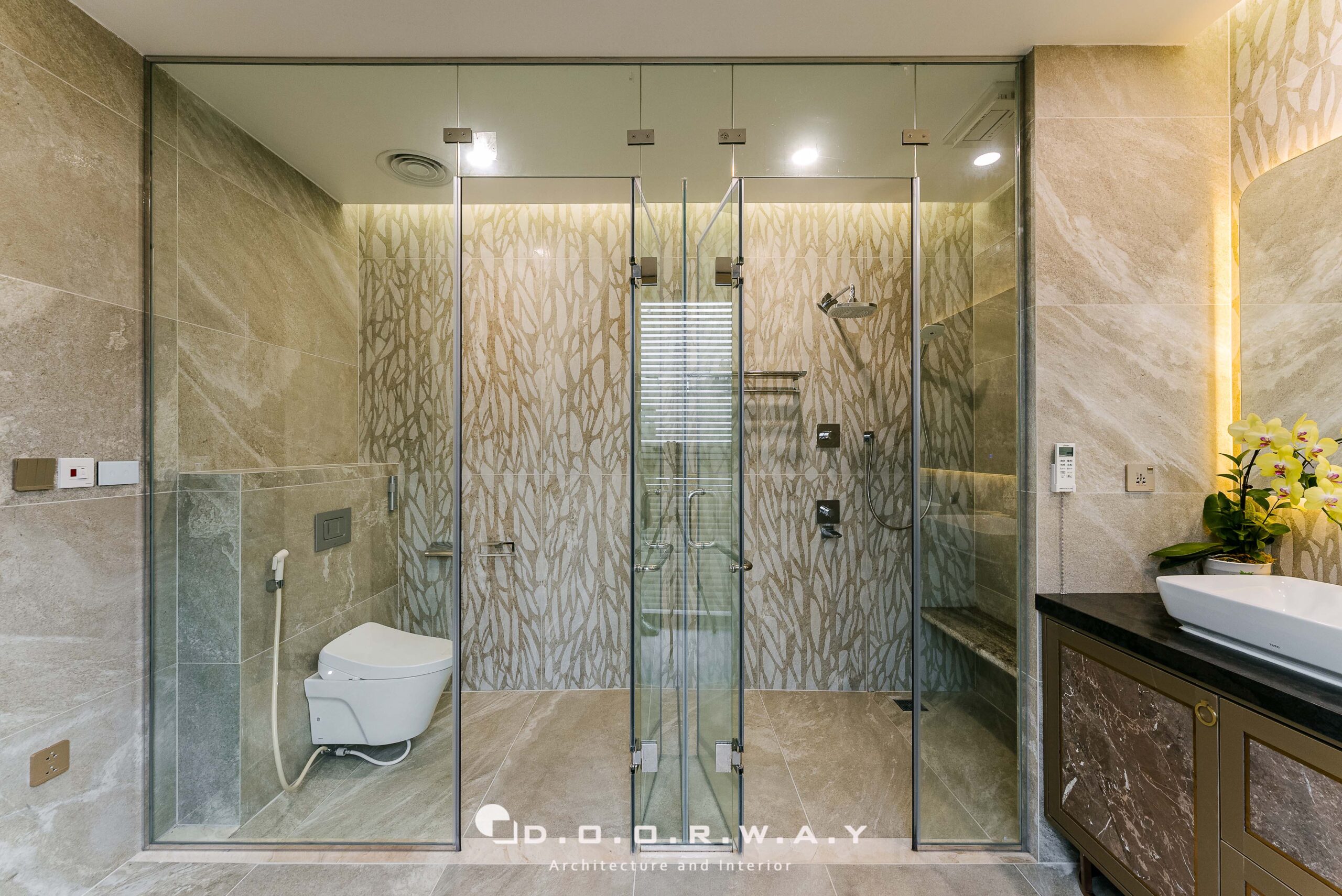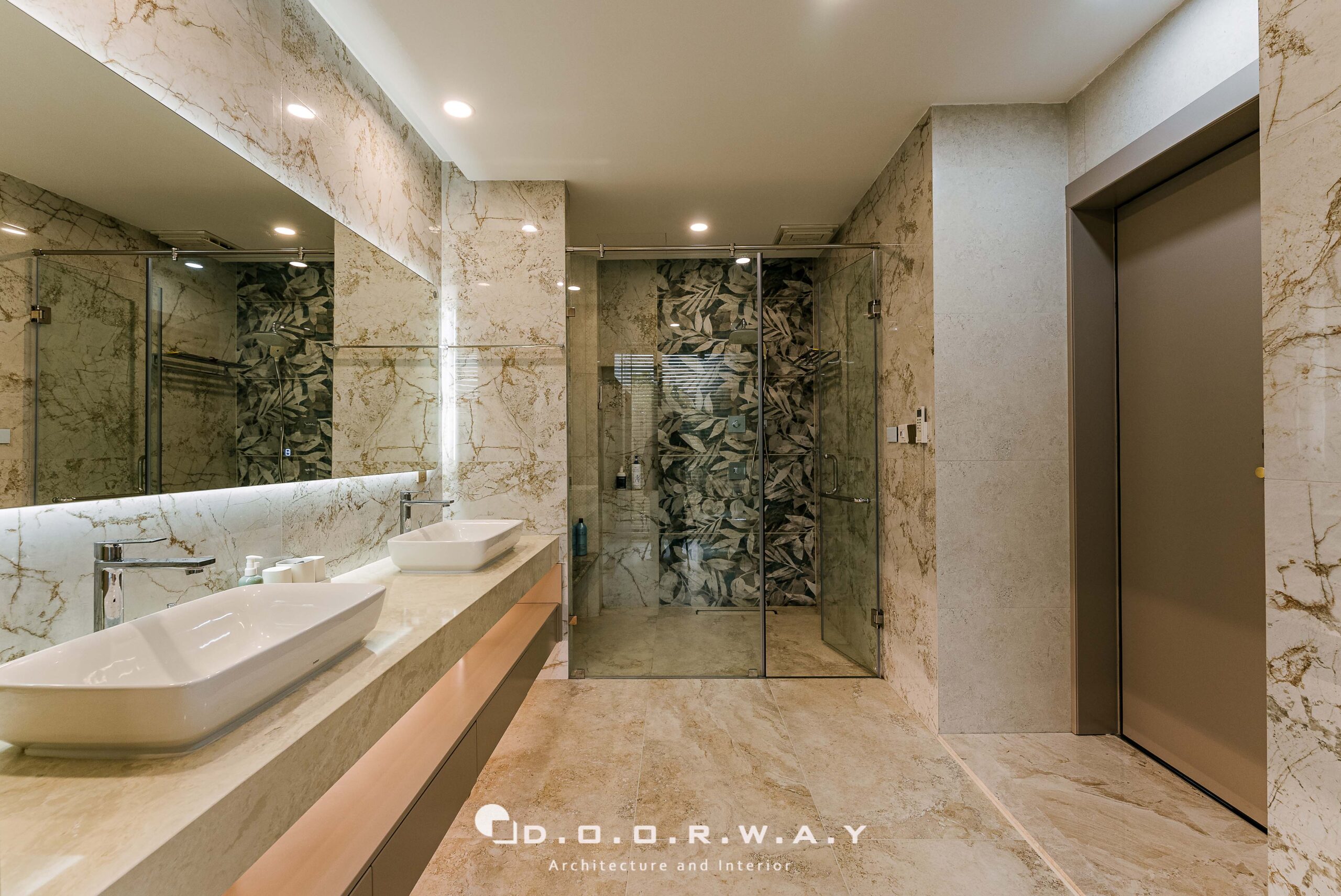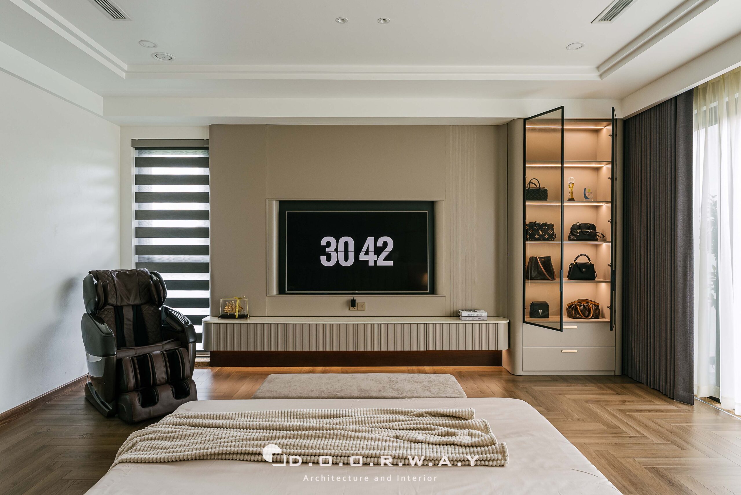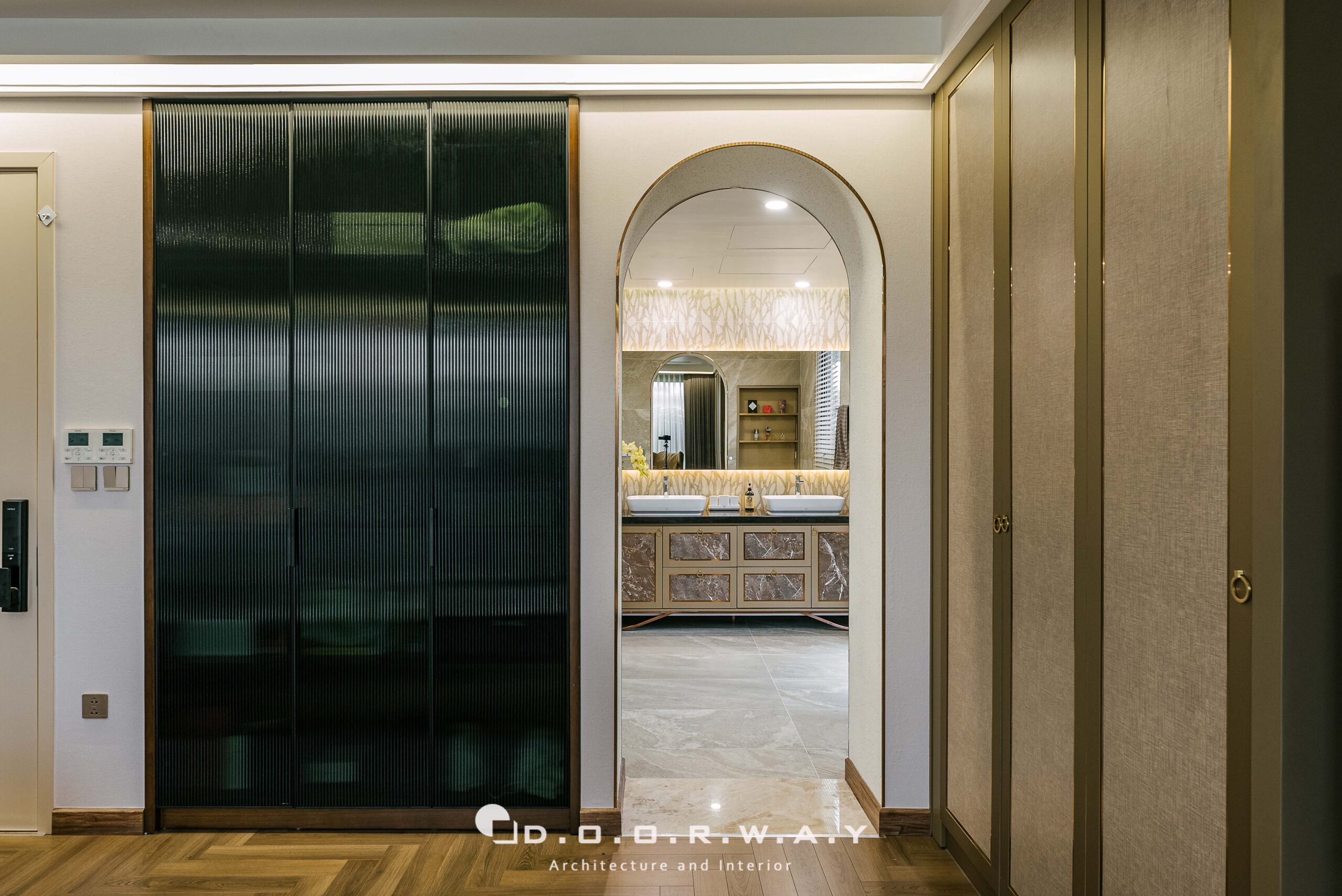 Đước ngăn cách với không gian chính của phòng ngủ và khu thay đồ, các kts D.O.O.R.W.A.Y đã tinh tế sử dụng hệ cửa dấu khuôn, để không làm ảnh hưởng đến tổng thể rộng rãi của căn phòng. phòng. Không gian phòng thay đồ không quá rộng nhưng vẫn đảm bảo sự sang trọng và tiện nghi với hệ tủ kịch trần cánh kính màu tối tạo chiều sâu huyền bí, những đường vân và ánh phản chiếu khiến từng bộ trang phục.