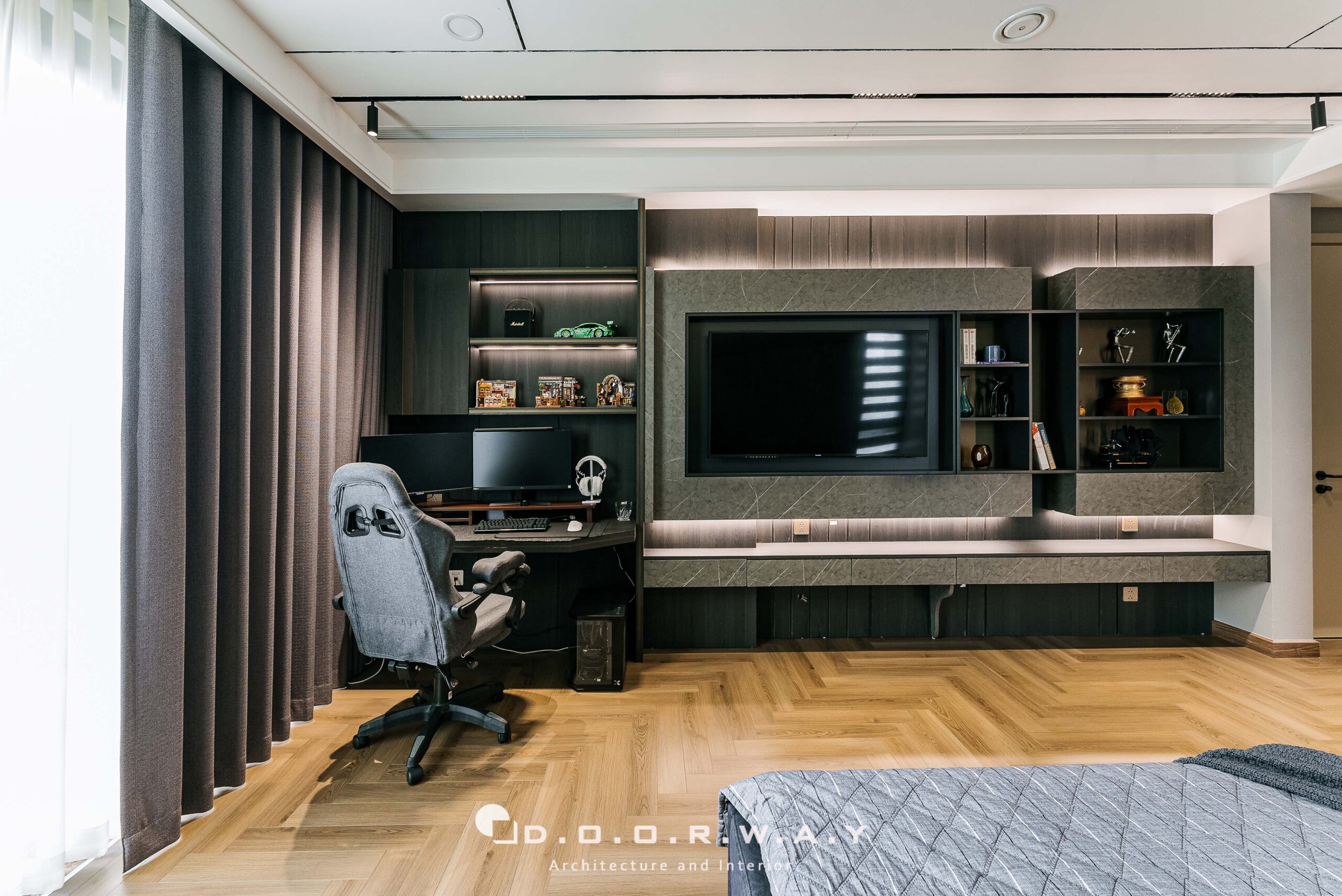 Chiếc giường ngủ gọn gàng đặt ở vị trí trung tâm, phần đầu giường được ốp nỉ, bên trên là bức vách ốp gỗ giả vải chia mảng nhấn nhá, vừa làm điểm tựa vững chắc vừa mang lại sự thoải mái khi nghỉ ngơi. Đối diện giường ngủ là kệ tivi và bàn làm việc hiện đại, thiết kế âm tường thông minh, vừa tiết kiệm diện tích vừa tạo nên tổng thể gọn gàng, sang trọng. Ghế gaming hiện đại, hệ thống máy tính kép cùng tủ trưng bày với đèn led tạo điểm nhấn trẻ trung, thể hiện gu thẩm mỹ tinh tế của chủ nhân căn phòng.Ở mảng tường đối diện giường, vách tivi được xử lý tinh tế, xen kẽ những đợt kệ lớn gắn tường, Mặt bàn rộng, gọn, đủ để cậu con trai vừa học tập vừa làm việc thoải mái. Không gian này còn trở thành nơi để bày trí những món đồ nhỏ, thể hiện sở thích và phong cách cá nhân