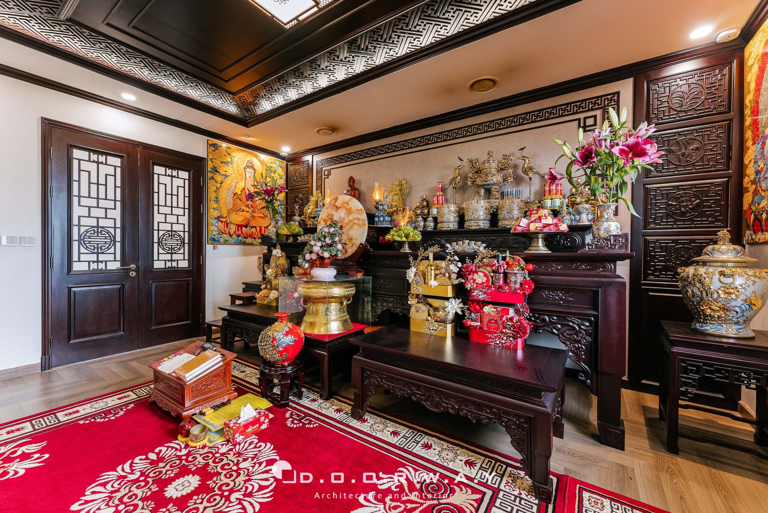 Trong thiết kế nội thất biệt thự, phòng thờ luôn là một không gian quan trọng, thể hiện đời sống tâm linh và truyền thống văn hóa của gia đình Việt. Tại biệt thự Gia Lâm, không gian thờ cúng được chăm chút tỉ mỉ, vừa sang trọng, hiện đại nhưng vẫn giữ được sự trang nghiêm, phù hợp với phong thủy. Nổi bật trong không gian là hệ thống bàn thờ gỗ tự nhiên, chạm khắc tinh tế. Các chi tiết như lư hương, lọ hoa, mâm bồng đều được lựa chọn kỹ lưỡng, phù hợp với tổng thể nội thất biệt thự cao cấp, tạo cảm giác uy nghiêm và trang trọng.
