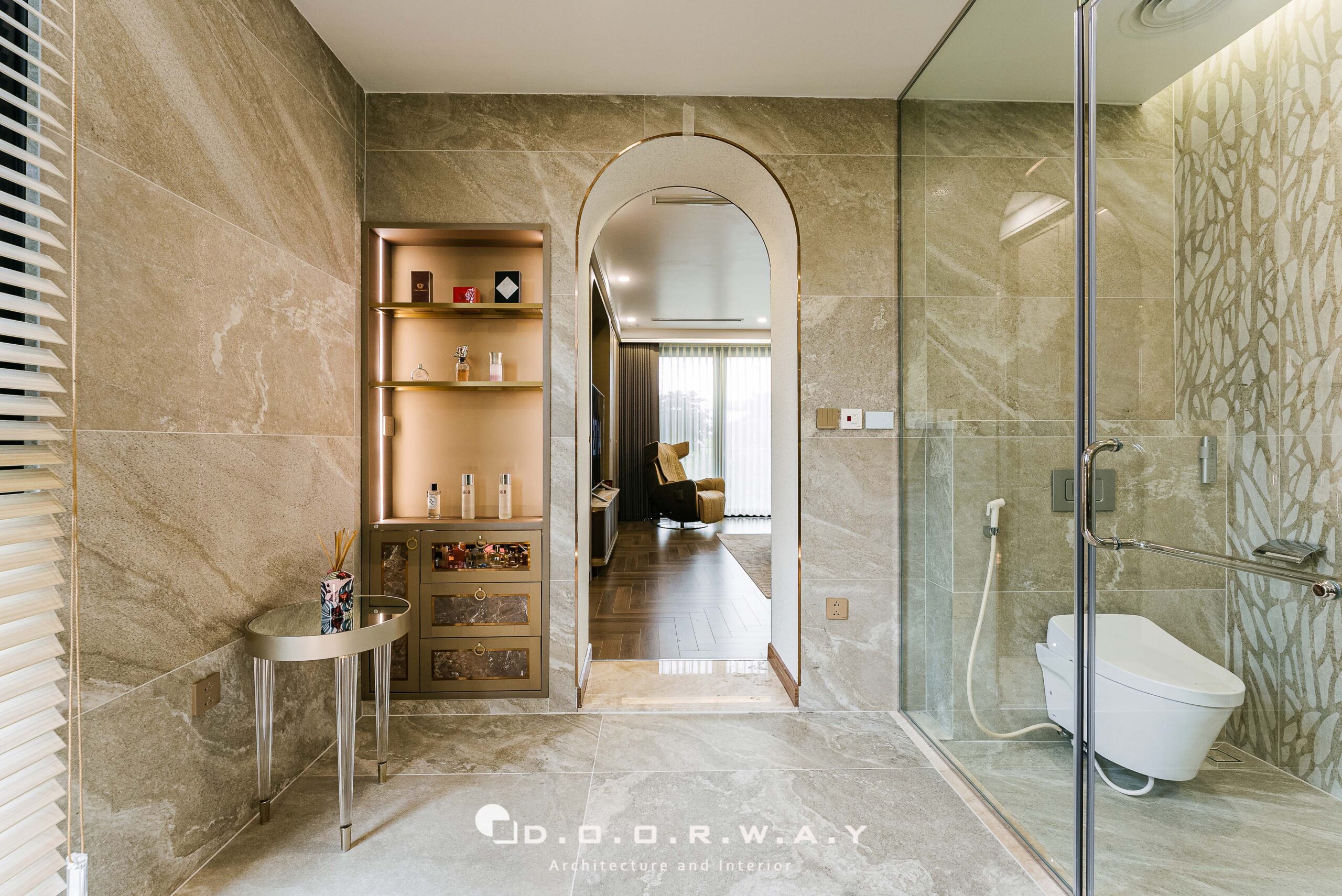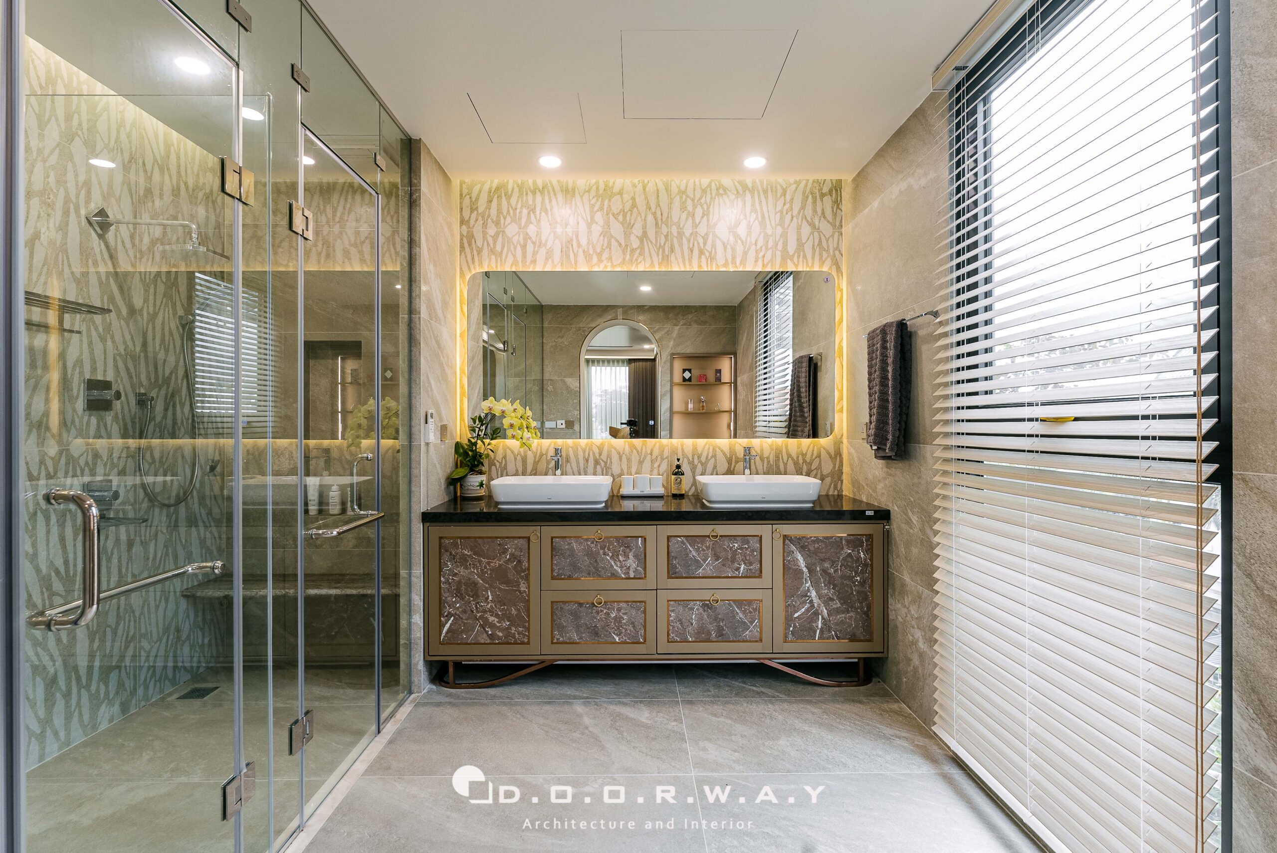 Điểm đến cuối cùng của hành trình trải nghiệm là phòng tắm khép kín, nơi đá marble sáng bóng kết hợp cùng gương lớn và ánh sáng hắt sau tinh tế, tạo nên một khung cảnh xa hoa, lộng lẫy. Lavabo đôi, chi tiết ánh kim sang trọng và khung vòm mềm mại khéo léo biến nơi chốn sinh hoạt thường nhật thành không gian thư giãn đậm chất nghỉ dưỡng.