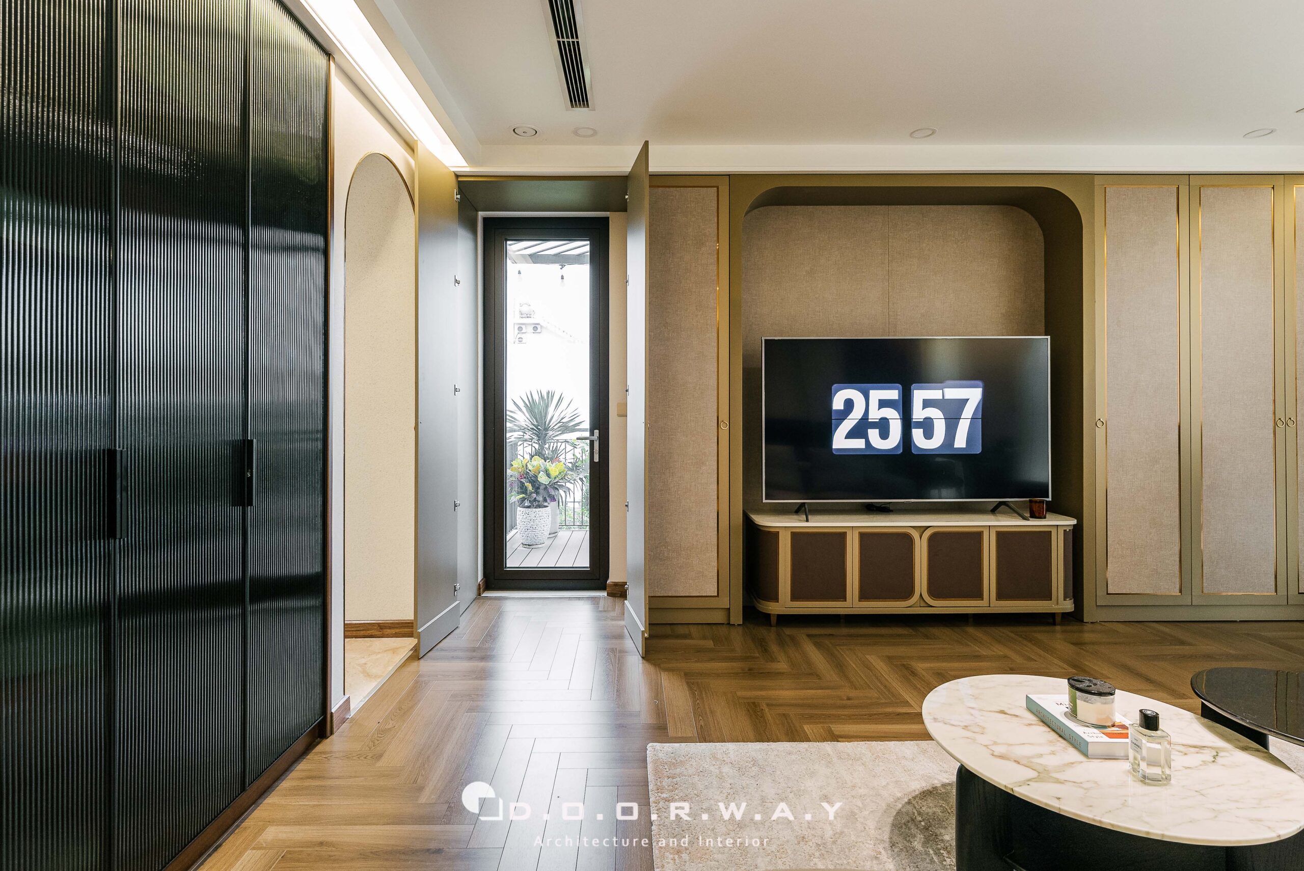 Đối diện là hệ vách tivi được thiết kế hiện đại, tinh gọn, hai bên khéo léo tích hợp tủ âm tường cao kịch trần. Đây vừa là giải pháp tối ưu lưu trữ, vừa tạo sự cân đối, liền mạch cho tổng thể không gian. Những đường nét phẳng, sắc gọn cùng màu sắc hài hòa giúp căn phòng giữ được vẻ sang trọng nhưng không hề nặng nề. Đằng sau hệ tủ liền mạch là hệ cửa dấu khuôn, tạo không một không gian đi ra khu ban công thư giãn bên ngoài