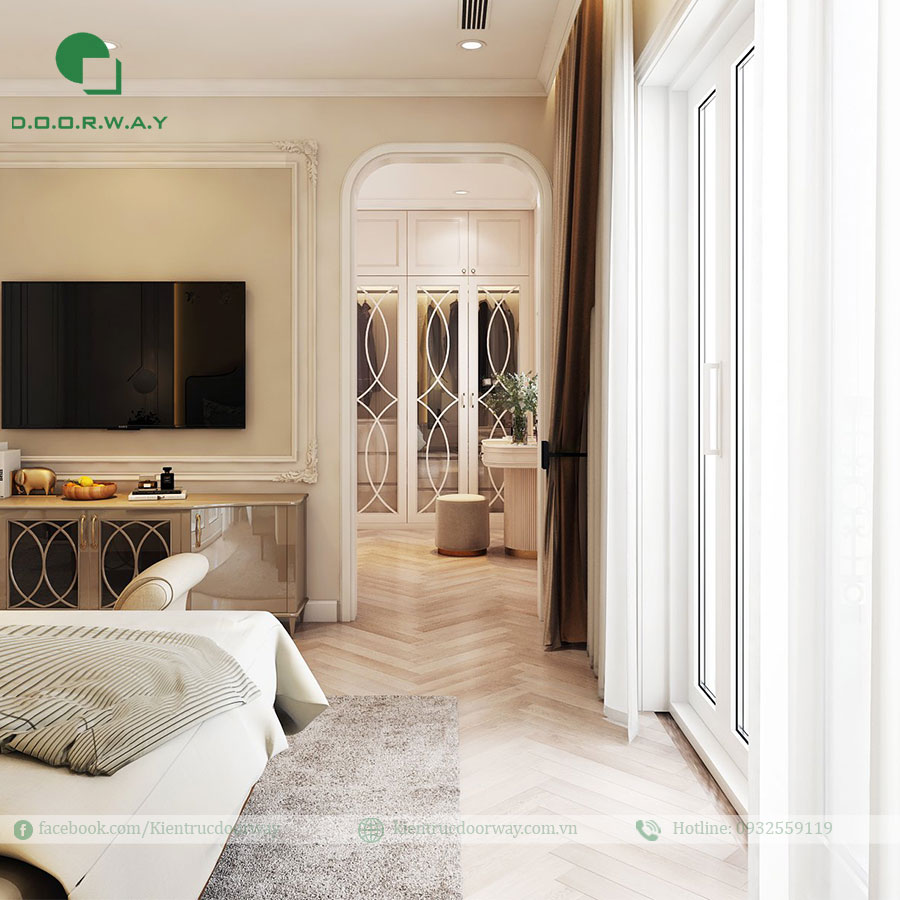 Sự kết hợp hài hòa giữa các món đồ nội thất từ đơn giản đến phức tạp, giản dị mà sang trọng, và cổ điển tới hiện đại,… tất cả đều với mục đích đem lại cảm giác thoải mái cho gia chủ. Không gian phòng ngủ Master tại biệt thự An Hưng khá rộng và dài, vì thế kiến trúc sư đã bố trí phòng thay đồ riêng được ngăn cách với không gian giường nghỉ ngơi bằng bức tường ngăn cách, với một lối nhỏ đi vào khu thay đồ, và bàn trang điểm. Hãy cùng xem 2 phương án thiết kế phòng ngủ Master dưới đây bởi các kiến trúc sư D.O.O.R.W.A.Y