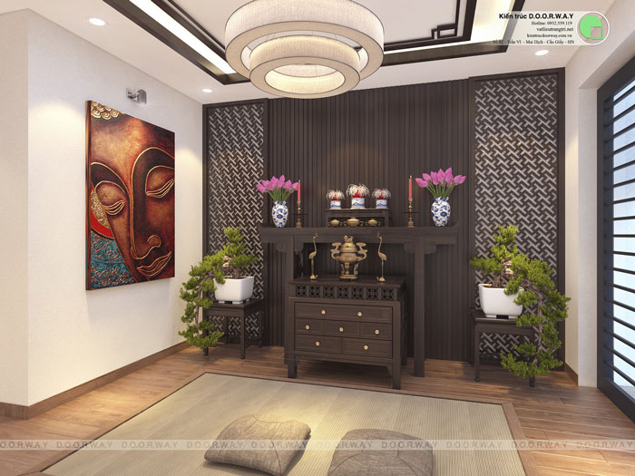Không gian trong phòng thờ được bố trí cân đối, hài hòa và toát lên vẻ trang nghiêm. Tông màu trầm ở khu vực bàn thờ thiết kế nổi bật nhất trong phòng khi bước vào. Bức tranh về phật treo trên tường xóa đi khoảng trống trong phòng. Để góp phần tạo nên nét bình yên, chậu cây cảnh đã được đặt hai bên bàn thờ.